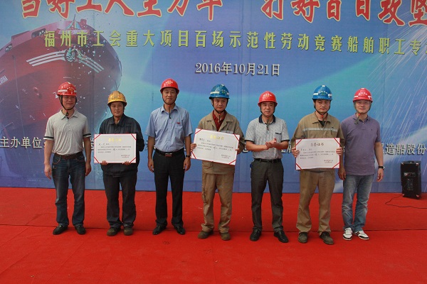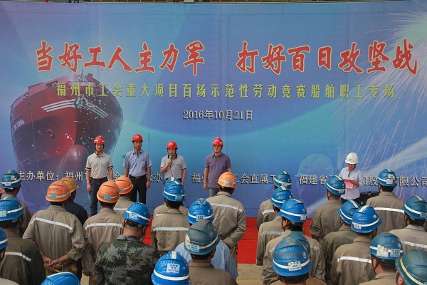 本報訊 10月21日上午9:30,福州市總工會直屬工會副主席潘孝平,主任郭孝祥,福州市總工會經濟部主任林昭亮一行蒞臨馬尾造船公司新址甲機電車間,參加“當好工人主力軍 打好百日攻堅戰”——福州市工會重大項目百場示范性勞動競賽船舶職工專場頒獎儀式。公司工會主席、紀委書記張建軍,工會副主席、黨群工作部部長李敦蓮,競賽工作人員,獲獎選手、集體代表和各作業課員工代表均到場參加。