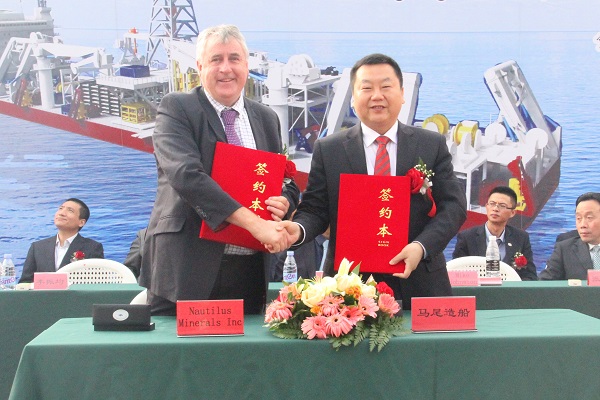 Mike Johnston先生與李振均先生分別代表鸚鵡螺礦業公司和馬尾造船公司就第二代深海采礦船簽訂合作意向書。