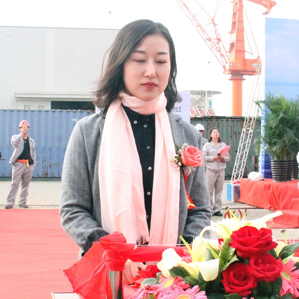 王鳳陽女士為227米深海采礦船下水剪彩、擲香檳。
